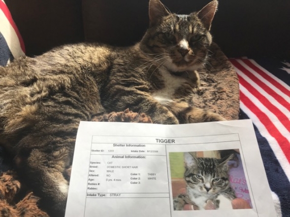 We heard from Tigger’s mom Nadia on his birthday in May. His family adopted him 13 years ago and say he is “still going strong!!” Here he is with original kennel card.