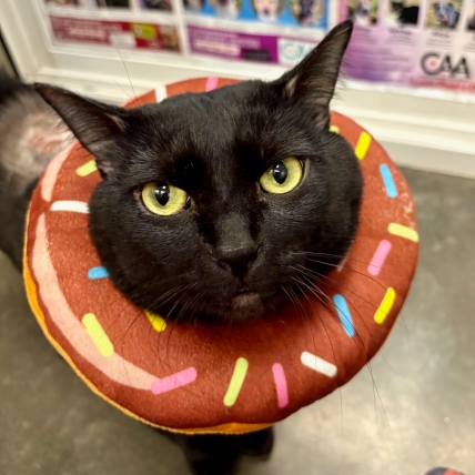 3 years old • 15 lbs • All black beauty Ricky is a gentle, sweet soul who just wants love and pets. Despite healing from what we believe was a burn, he’s been such a brave little trooper—still kind, still trusting, and full of love. He’s currently rocking a donut while he heals (and it’s pretty adorable