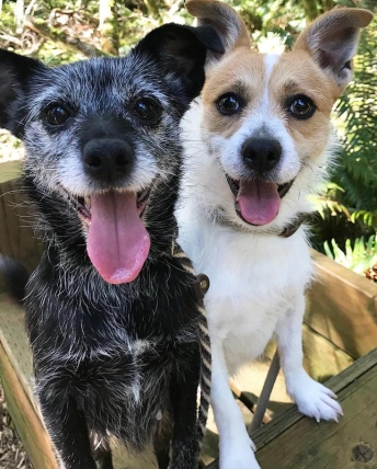 Sam and his mom Maggie are a bonded pair. Maggie is friendly and comfortable with all of us and with all of the dogs at the shelter. She’s been to two adoption events and welcomed everyone who stopped by to say hi. Sam is a little anxious but he is happy and confident as long as he’s with Maggie, so they will be adopted as a bonded pair. Once Sam gets to know you he is friendly and affectionate, and loves walks with the volunteers. He can be skittish, so we’re recommending no children. These two will need a fully fenced yard, but will be content to curl up with you in the house most of the time.