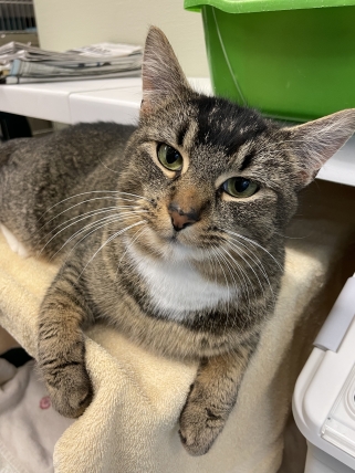 This sweet tabby is a true love. At just about a year old she’s already an expert at making friends with people who can give her those chin rubs she likes so much. This outgoing and calm girl is looking to be your one and only feline love and she’ll reward you with loads of affection.